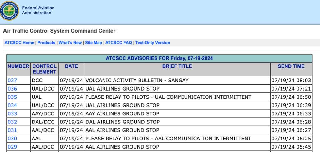 As we learnt over the weekend, it took a faulty update to grind the world to a halt. I remember taking a look at the FAA Air Traffic Control System Command Center Advisories that evening (US morning) and how the top 3 airlines were notifying the FAA about Halting All Operations.
